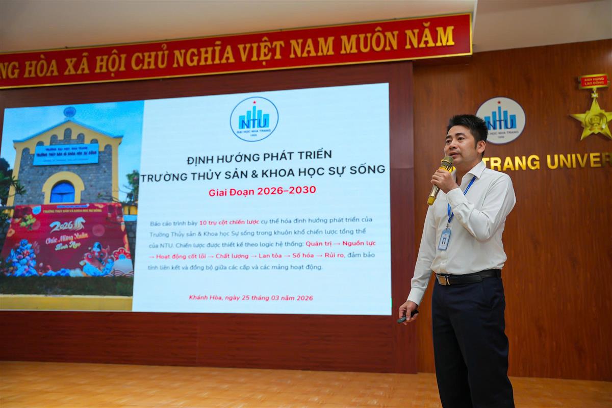 Sáng ngày 25/3/2026, Trường Thủy sản và Khoa học Sự sống đã tổ chức Hội nghị "Định hướng và chiến lược phát triển Trường Thủy sản và Khoa học sự sống giai đoạn 2026-2030" tại Hội trường số 3 nhằm xác định mục tiêu phát triển theo hướng hiện đại, bền vững và hội nhập quốc tế, từng bước khẳng định vị thế là đơn vị đào tạo và nghiên cứu uy tín trong lĩnh vực thủy sản trong giai đoạn 2026-2030.